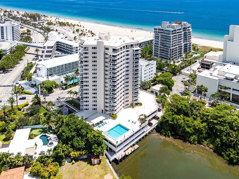 Experience coastal living at its finest in this light-filled beachfront corner unit with private balcony and breathtaking views from every room. Thoughtfully designed, it features an oversized bedroom w/ en suite bath, plus a convenient guest bath off the living area for privacy. Expansive kitchen is ideal for everyday living/entertaining. Other highlights: Walk in closet, in-unit washer/dryer, assigned covered parking, and private storage locker, heated pool, Peloton-equipped gym, 2 BBQ areas, community dock (kayak/paddleboard), bike storage, 24hr security. Pet-friendly (2 pets up to 25 lbs).Prime locationjust steps to the widest stretch of Fort Lauderdale Beach, one block from Marina Village, one mile to Las Olas Blvd. Close to dining, shopping, marinas & airport and more!