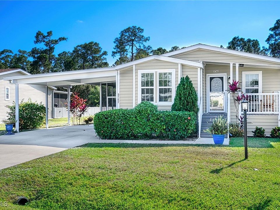 Step into this well maintained, newer, 2019 home in the desirable 55+ community of Country Lakes. Situated on your own spacious private lot with a peaceful wooded backdrop, this residence offers a warm and inviting great-room layout with 2 bedrooms, a study, 2 full baths and 1445 Sq Feet. . Bright and airy with vaulted ceilings, the home features an upgraded island kitchen with stainless steel appliances and quality cabinetry. Both bathrooms, flooring, and windows have been upgraded as well. Enjoy the comfort of a screened lanai and the convenience of a spacious attached storage shed.