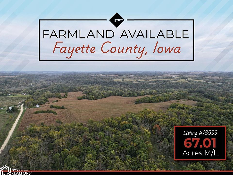 Offering 67.01 acres m/l of land that provides the perfect balance of strong agricultural income and exceptional recreational opportunity, located between Wadena and Fayette in the heart of Northeast Iowa. The farm features 51.91 FSA cropland acres carrying a CSR2 of 61.6. The main soil type is the highly productive Fayette silt loam, providing consistent crop income and long-term investment value. The balance of the farm consists of nearly 16 acres of thick timbered draws with multiple locations for deer stands. In addition to the timberland, the property is directly adjacent to public hunting at the Grannis Creek Wildlife Area. Grannis Creek is a well-known trout fishing stream, and the Volga River and Volga River State Recreation Area provide endless recreational opportunities nearby. This unique setting combines the steady return of farmland with the wide range of recreational opportunities in the picturesque driftless region of Iowa. Whether you're looking to expand your farming operation, diversify your land portfolio, or secure a private getaway with excellent hunting and recreation opportunities, this farm checks every box. The farm is located in Sections 30 & 31 of Illyria Township, Fayette County, Iowa. *Some trees have been identified by a logger and are going to be removed from the property after harvest. *All offers are subject to court approval.