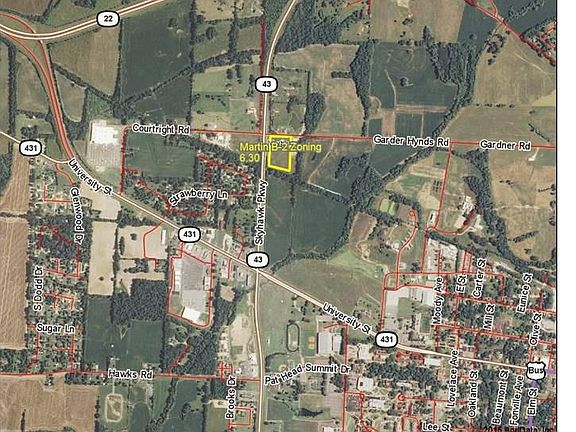 OVER 6 ACRES OF COMMERCIAL B-2 LAND IN GREAT LOCATION IN MARTIN,TN FOR $285,000! This property is located on the corner of Highway 43 and Garner Hyndsver Rd. centrally located between University St. (DTC of 12,000) and Highway 22 (DTC of 5,000). Easy access, great visibility, no fence, ready to be developed with potential high cap investment. Enough land to meet your development needs.