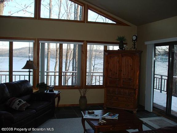 On Lake Wallenpaupack, Cedar & Field Stone Lake Front with breathtaking panoramic views for miles! Lake views from every room! 2 master suites with second floor having a private balcony! Open Great Rm w/wood burning fireplace, 4 Bed Rms, family room in w/woodstove. Central air, security system, beautiful kitchen, lots of closets, one bath with whirlpool tub, private 'U' shape dock, 2 car garage, Baths: 1 Bath Lev 1,1 Bath Lev 2, Beds: 2+ Bed 1st,2+ Bed 2nd, SqFt Fin - Main: 1185.00, SqFt Fin - 3rd: 0.00, Dining Area: Y, Modern Kitchen: Y, SqFt Fin - 2nd: 510.00