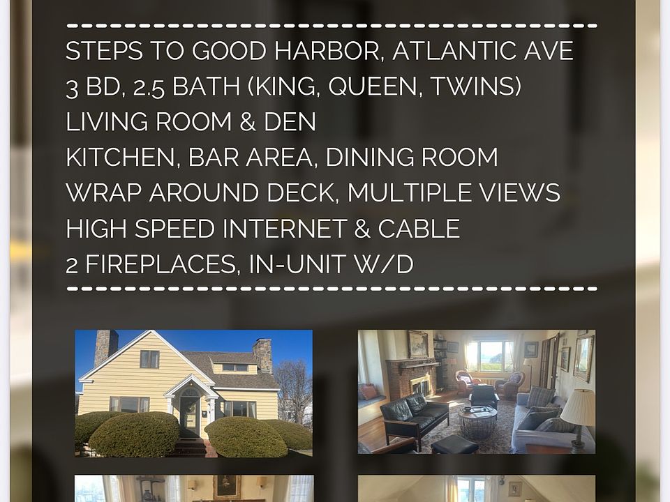 This monthly rental is a perfect getaway, contact owner for rates & availability. Main unit (floors 1-2) of 2-family home. Stunning views and walking distance to Good Harbor beach and Atlantic Avenue. Beautiful walks and grassy area behind and in front of house. 3 bedroom 2.5 bathroom house with dining room, living room, den, and kitchen. Cozy bar area connecting den and dining room. Quiet quaint neighborhood with access to local shops, cafes. Main unit of 2-family spacious, charming home in a beautiful neighborhood! Monthly rent ranges from 5-11k monthly (all-in) depending on season; many months still available, looking for respectful, quiet tenants interested in calling beautiful Good Harbor home for one or more months. non-smokers only, certain pets permitted. Text, message or email to learn more! This vacation rental is available certain months throughout all seasons and prices vary depending on the month. Rental rates are all-in. Inquire for details!