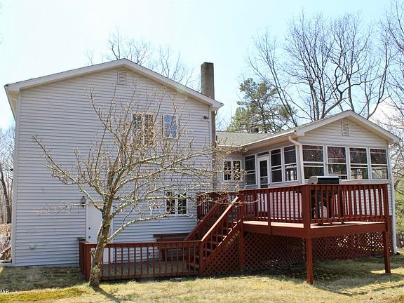 Traditional brick and vinyl home featuring 4 bedrooms, 2.5 baths, 1 car heated garage, brick faced fireplace, 3 season room, rear decks and expansive, bright kitchen. Home encompasses 2 lots with gardens, mature trees and privacy. Wonderful, clean, well loved home ready for its next family. Taxes are $4100 a year and the secured community of Pocono Ranchlands offers fun for the whole family with tennis, pool, horse stable and clubhouse