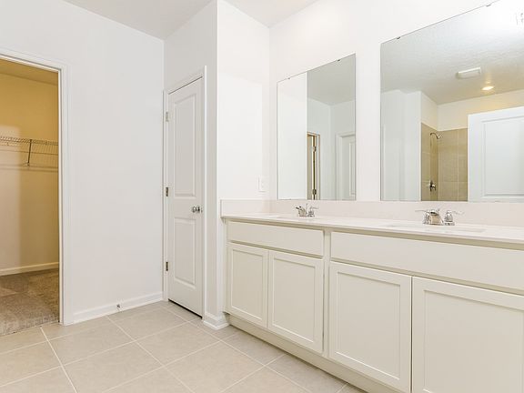 Primary suite with walk-in closet and en-suite bath featuring dual vanities and a walk-in shower.
