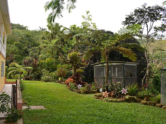 Beautiful and tranquil country sigle family home on top of a mountain in Cayey, Puerto Rico. View of the city and lush surroundings. The property has two large buildings, a 2-story home as well as a large aluminum storage shed. Eight acres include a rain forest, river, as well as a multitude of fruit, vegetable, and flower plants. The property is fenced with a paved entrance and motorized entry gate. Modern kitchen, large living area, wrap around balconies, and spacious bedrooms. Solid concrete wall and ceilings, water cistern, gas generator, and hurricane resistant aluminium and glass windows. The secluded home is the ideal country home. It can also be used as a farm or to grow exotic plants. The large aluminum shed (hangar) can be used to grow plants indoor (hydroponics). The location is also optimal for solar panels or other alternative energy sources.
