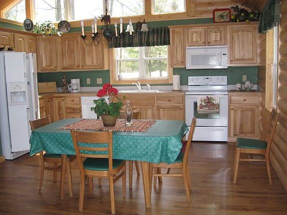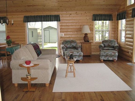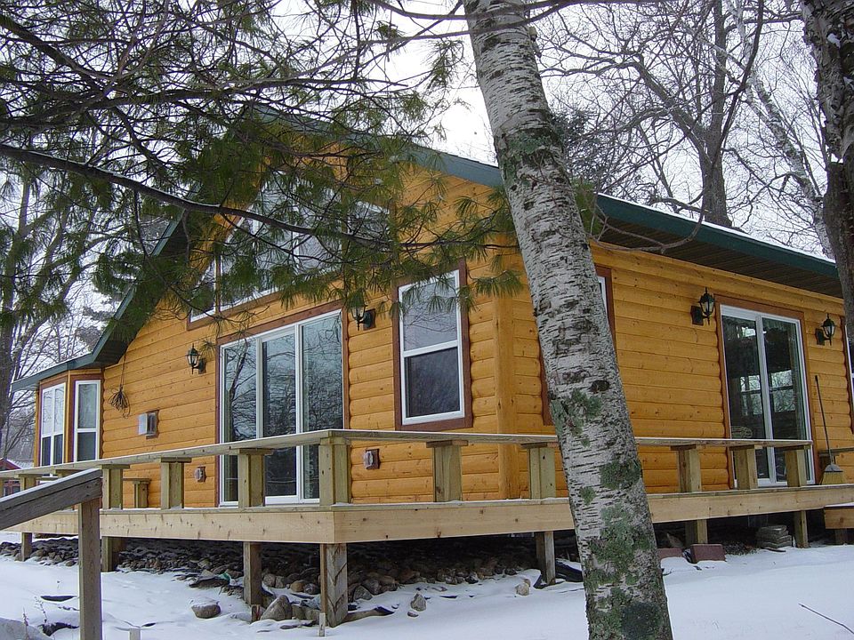 This 2 BR 2 bath home is all on one level and has been completely rebuilt with rustic hand hewn pine 1/2 log siding on the exterior, also used as accents onthe interior walls including the trim on the trapezoid windows. Vaulted pine ceilings with a fieldstone gas fireplace in the Great Room. A master suite with abay window overlooks the open waters of the Boy River with an additional large guest bedroom and bath. All on approx 2.4 acres of land with 250 ft of riverfrontage and 150 ft of lakeshore on Little Woman!!! Great fishing for pan fish & Bass off the dock, (I know, because I did it!) Additional buildings include agarage & bunk house. All interior colors & decorating very well done, totally immaculate throughout!! With boating access to Woman Lake!!!
