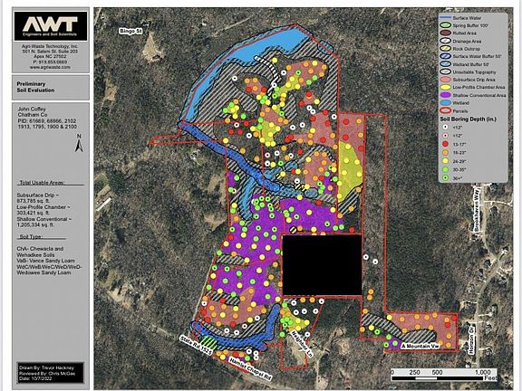 Parcel #s 61669, 68866, 2102, 1795 and a part of parcel 1900 (6.00 +/- Northern P/O Parcel 1900 as shown on listing photo) for a total of 109+/- acres. 719' of road frontage off Hamlets Chapel Rd. The first 1,700 feet of road for the Hamlet Ridge subdivision has been surveyed and engineered (not constructed) and would provide access for the first 16 lots. The 109 acres has been soil tested for potential septic system areas by soil scientists of Agri Waste Inc. The property has good conventional soils for a residential subdivision and county water available. Road frontage for entrance. Permits from the North Carolina Water Quality Department and the U.S. Army Corp of Engineering have been obtained for the creek crossing and buffers. The initial information has been submitted to the Chatham County Planning Department for the subdivision process. Potential for more than 45 lots per seller. Additional permits and reports are available. Email is best first communication. For easiest access drive down the Triangle Training Center gravel road, look for the real estate sign on the right and enter property at that point.