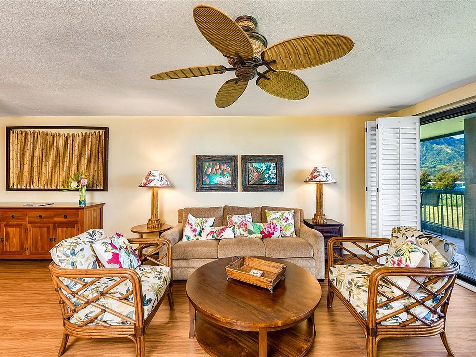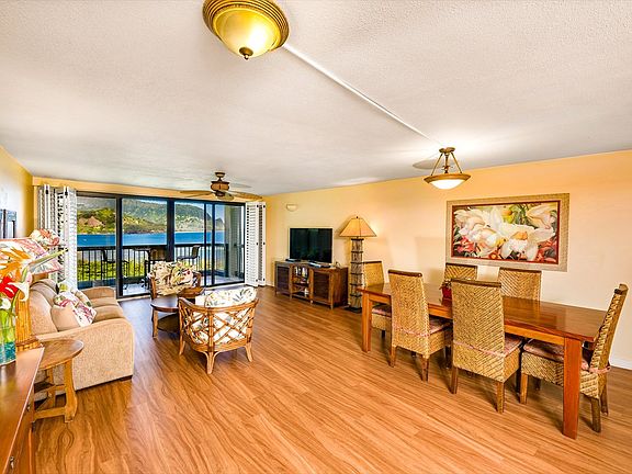 STUNNING BALI HAI VIEW – THE MOST SOUGHT AFTER ON KAUAI!! Located in the premier building in the beautiful Hanalei Bay Resort on the North Shore, this THREE BEDROOM, THREE BATH condo has sweeping views of the bay, ocean, mountains, waterfalls, and the beach below. From the lanais, watch the sailboats in the summer, breaking waves in the winter, whales in season, and sunsets in the evening. This second level unit has minimum steps and is away from the busier areas of the resort. THIS CONDO IS PRICED TO SELL. It is currently a very successful vacation rental even with the owners reserving some time for their own use. The large three bedroom condo commands premium rental income whether rented by the night or for a longer period. The view is the “WOW” factor when opening the front door. The HBR maintenance fees include telephone, electricity (air conditioning), television cable, water, WIFI, use of 8 tennis courts, multiple pools, shuttle service, a fitness center, and many special activities. One check covers everything except taxes. The 22 acres of manicured grounds with beautiful flowers and shrubs make this property one of a kind. The pool areas include a swim up bar, a waterfall, and a hot tub. The Happy Talk Lounge offers food , drinks, and live entertainment. You have the best of resort living with your own private space. Nearby, are all of the amenities that Princeville has to offer. All furniture and accessories are included. It must be seen to appreciate the care and detail the owners have put into it. The island decor with ceiling fans and wood floors give the ambiance of romantic, old Hawaii. New owners can move in with little or no stress. Condos with this view and at this price do not come on the market very often. Is this the time to stop just dreaming about Kauai and become a part of it? (All information contained herein is deemed reliable but not guaranteed.)