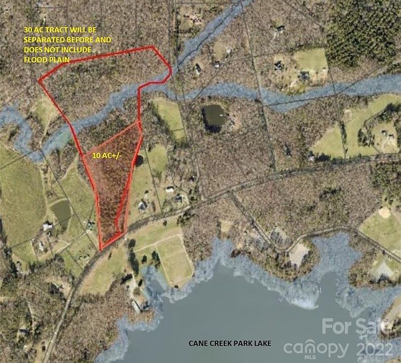 LAST LAND AVAILABLE ACROSS FROM CANE CREEK PARK WITH WATER VIEW. 10 Ac will be severed from a 30 ac tract. Land is pretty level and beautiful! Property is perfect for a great home with this one of a kind tract. Imagine a water view home across from an 1100ac park with a 350 ac lake! PARK HAS MILES AND MILES OF EQUESTRIAN TRAILS, HIKING AND BIKING TRAILS, TROPHY BASS LAKE, BOATING, TWO BEACHES, VOLLYBALL, BASEBALL DISK GOLF, AND SO MUCH MORE. This is for serious buyers who know that unique tracts will soon be gone. Why build anywhere else, when you can have it all at your front doorstep! Approx 6 miles from downtown Waxhaw No town taxes, No restrictions, NO HOA.