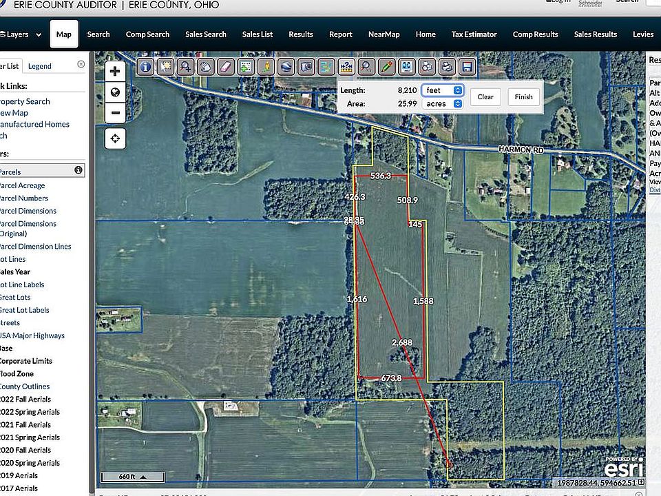 Two parcels, front parcel on Harmon Road with 590' frontage, this parcel #07-00656.000 56.73 Acres, 31 tillable acres with the balance wooded, and 09-00022.000 33.75 Acres, 19.49 tillable, balance wooded.