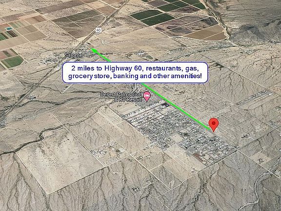 Call or text the property owner, Kevin Corcoran. Contact information and website link can be found at the bottom of this page called: "See listing website". Salome AZ – RV & Travel Trailer Lot w. Water & Power to Property, 8,276 SF, Mf’d Homes Also Allowed, 98 Miles to Phoenix, 96 Miles to Lake Havasu! Clean 85' x 100' RV lot with water and power service to the property line on paved Harquahala Rd in walking distance to Tri County Medical Center, the Indian Hills Airpark airport and just two miles to restaurants, the grocery store, post office, gas stations, banking, and other amenities - all in the beautiful Harquahala Valley, nestled between two gorgeous mountain ranges! What makes this property special is that you can legally park an RV, travel trailer, or 5th wheel on the lot year-round with the installation of a septic system and purchase of a one-time placement permit of $250. The approximate cost to install a septic system is $4,000-$5,000 and there are three septic companies in the area to choose from. Power is serviced through APS and water service is through Harrisburg Utility Co. Recreation opportunities abound with hiking, horse back riding, mountain biking, and off-roading just outside of town. Salome, AZ is two miles from Highway 60, two hours from Phoenix as well as a two hour drive to Lake Havasu and the Colorado River to enjoy everything that Western Arizona has to offer!