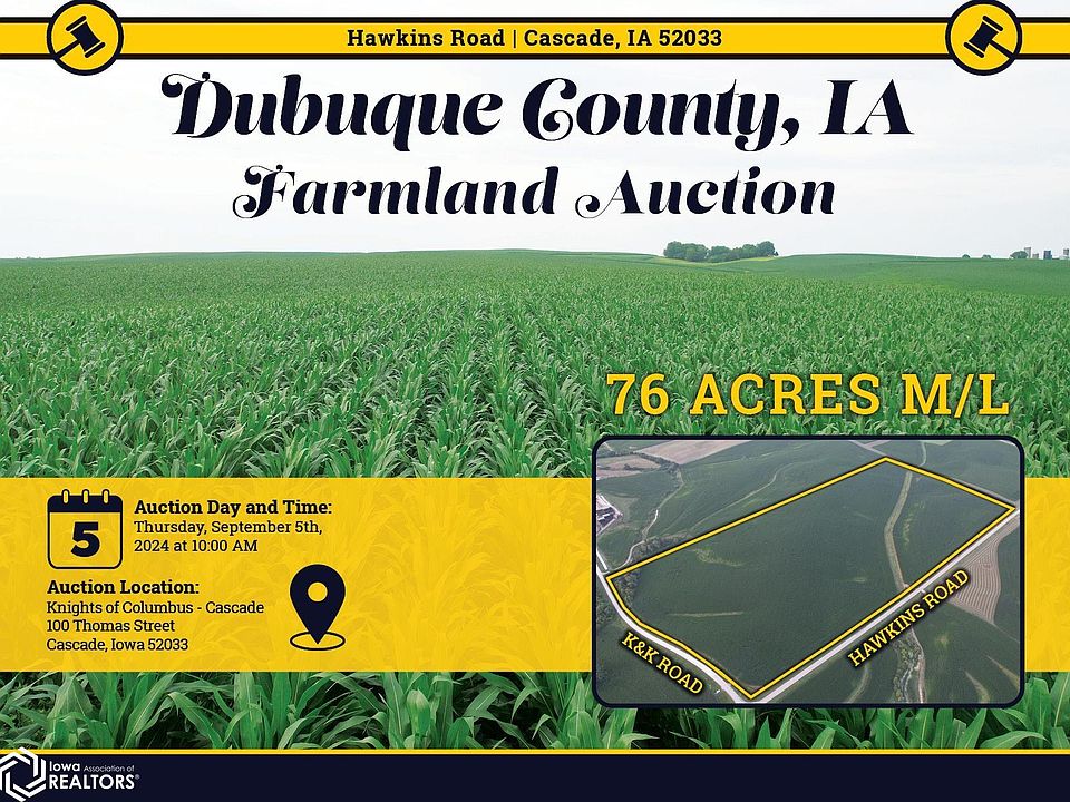 Mark your calendar for Thursday, September 5th, 2024, at 10:00 AM CST! I'm excited to present the Gladys M. Knepper Estate land auction, featuring 76 total acres m/l in Dubuque County, Iowa. Located between Cascade and Worthington, this prime east-central Iowa farm boasts 70.51 FSA tillable acres m/l with a CSR2 soil rating of 54.4. Of those, 69.57 acres m/l are actively farmed, while 0.94 acres m/l are enrolled in a CP8A CRP contract, paying $220 annually. The farm's primary soil types include productive Downs silt loam, Fayette silt loam, and Fayette silty clay loam. Situated on the north side of hard-surfaced Hawkins Road and the east side of K&K Road in Section 10 of Cascade Township, this farm offers a fantastic opportunity to expand an existing operation or diversify an investment portfolio. Its proximity to the Ethanol plant in Dyersville and multiple grain elevators enhances its grain marketing potential. The single tract will be offered on a price-per-acre basis via Public Auction at the Knights of Columbus in Cascade, Iowa. For those unable to attend in person, a Virtual Online Auction option with online bidding will be available. Don't miss out on this excellent investment opportunity in Dubuque County, Iowa! ***A survey is being conducted by Weber Surveying, LLC on the west parcel (1810100003) where the road divided said parcel. Only the land on the east side of K&K Road will be sold. The farm will be sold price-per-acre, multiplied by the gross acres.