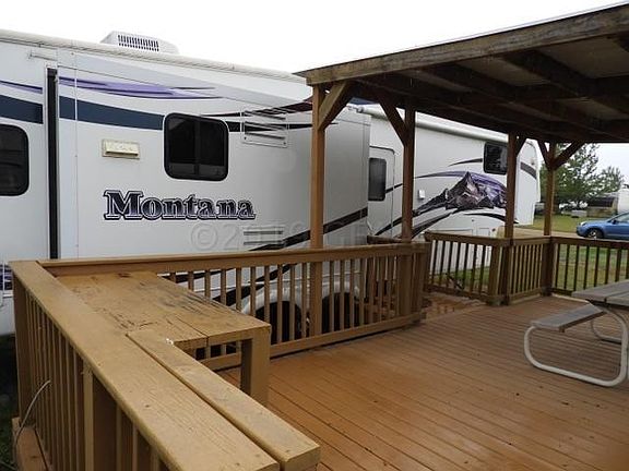 34' 2008 Keystone RV Montana 5th Wheel Camper with 3 slides. Located at Haybale Heights Campground. Includes Covered deck, washer and dryer and storage shed. Lot rent is 1900/yearly which includes water-sewer-garbage, lake access and fish cleaning station.
