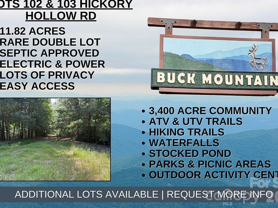 This listing offers a RARE OPPORTUNITY to purchase a DOUBLE LOT totaling 11.82 acres in sough-after Buck Mountain. Build your mountain home here and enjoy spectacular views with some tree trimming. Each lot already has their own driveway in place, making access easy. One home can be built on each lot or combine the lots into one parcel. The choice is yours! With level and gently sloping terrain, both lots have multiple building site options. Lot 102 has a current 3-bedroom septic permit, valid until 2032. Electric is nearby and FIBER OPTIC is available. Private setting offers an escape from the stress of daily life. Conveniently located in the 3,400 acre Buck Mountain community, the ONLY GATED ATV COMMUNITY in Wilkes County. Long-term and short-term rentals are allowed. Buck Mountain is a PRIME LOCATION! Arrive at the gate from Winston in only 1 hour and from Charlotte in 1 hour 40 min. Just minutes from High Country activities. Centrally located 35 minutes from Boone, West Jefferson, and Wilkesboro. Close to BLUE RIDGE PKWY, ASU, shopping, dining, golf, wineries, breweries, mountain biking and skiing. BUCK MOUNTAIN HAS HARD TO FIND AMENITIES like ATV Trails, Hiking Trails, Parks, Fishing Pond, Water Falls, Pavilions, Community Center, Helipad, Outdoor Activity Center with amphitheater for live music, community gatherings and so much more! Make lasting memories while spending the day hiking or riding ATVs on the miles of trails. 1,400 SF minimum building requirement. NO TINY HOMES. NO MOBILE HOMES. NO CAMPING. NO SELLER FINANCING.