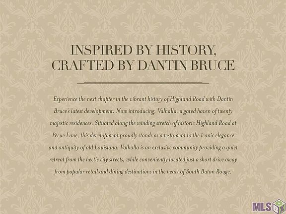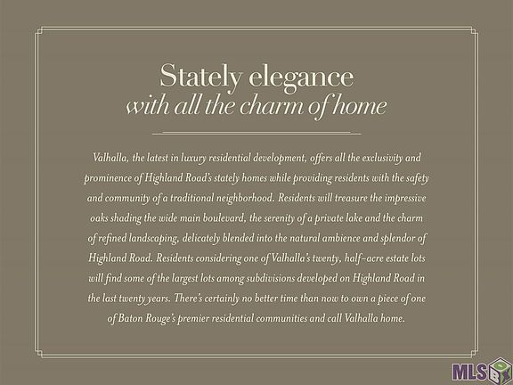 Valhalla a gated haven of 20 half acre plus lots. Experience the next chapter in the vibrant history of Highland Road with Dantin Bruce's latest development. Situated along the winding stretch of Highland Road at Pecue lane. Valhalla is an exclusive community providing a quiet retreat from the hectic city streets, while conveniently located just a short drive away from popular retail and dining destinations in the heart of South Baton Rouge. Valhalla, the latest in luxury residential development, offers all the exclusivity and prominence of Highland Road's stately homes while providing residents with the safety and community of a traditional neighborhood. Residents will treasure the impressive oaks shading the wide main boulevard, the serenity of a private lake and the charm of beautiful landscaping.