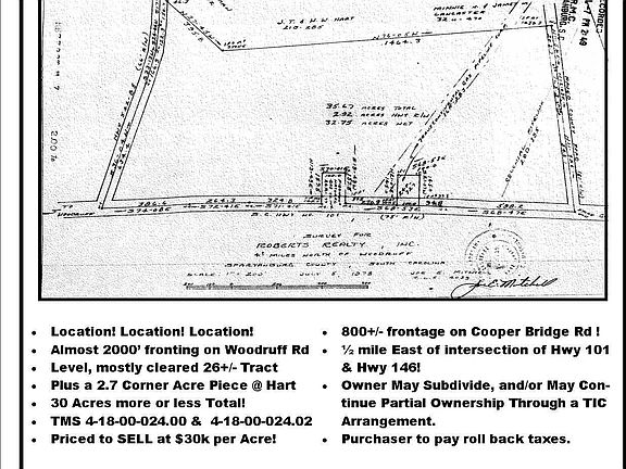 THIS IS THE PRICE PER ACRE,Level, mostly cleared 26+/- tract with almost 2000’ fronting on Hwy 101, plus 800+/- feet frontage on Cooper Bridge Road. Location is about 1 mile West of Woodruff Chevrolet, & ½ mile East of intersection of Hwy 101 & Hwy 146! Owner will subdivide, will continue partial ownership through a TIC arrangement, entire block between Hart Road and Cooper Bridge Road is included. Price per acre is net, your survey. DOT project for 4-lane highway is clearly marked, acquisitions by DOT are complete. Purchaser to pay roll back taxes.