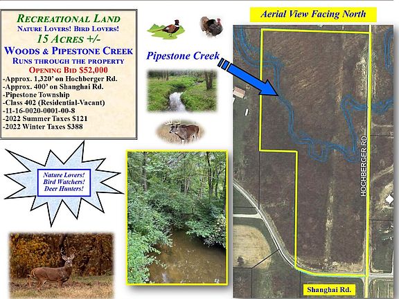ON-SITE AUCTION: Wednesday, October 4, 2023 @ 12 Noon! Escape the noise of daily living in this haven for nature enthusiasts. Pipestone Creek flows across 15 acres of wooded beauty. This recreational land is a blank canvas awaiting your vision. Whether you seek a personal sanctuary; bird watching or hunting retreat, this property has the potential to fulfill your dreams. AUCTION TERMS: $5,000 Non-Refundable Deposit Day of Auction, Balance Due October 27, 2023. Land Sold in ''As-Is'' Condition. Transfer with Title Insurance and New Deed. No survey; transferred by current legal description. Announcements Made Day of Auction Supersede Printed Material. Pre-View Land at your own risk any time before the auction. 10% Buyer's Premium Added to Final Accepted Bid to Get Contract Price. All bids are subject to Sellers' approval. Contact Pipestone Township for use and zoning. Subject to current easements. Come and bid or make your offer! Minimum starting bid price of $52,000.