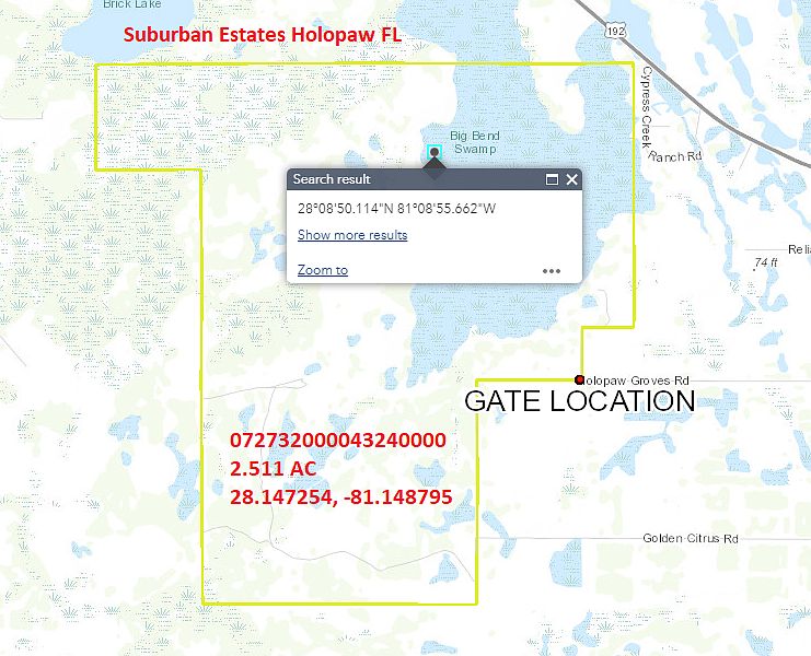 Suburban Estates Recreational Land This is a LOCKED GATE recreational area, with entrance off Holopaw Groves Road, under authority of SEPA. Ownership gets you a deed to get access to a key to the gate to get in to use 10,000 acres of recreational land. Keys are issued and registered to lots, you must buy a lot to get a key! I'm in Tucson Arizona and just purchased the land. Seams like a popular place after my research. Just not very familiar with the area. Need financing. We can help with that using our easy qualifying program. Let us know what works for you