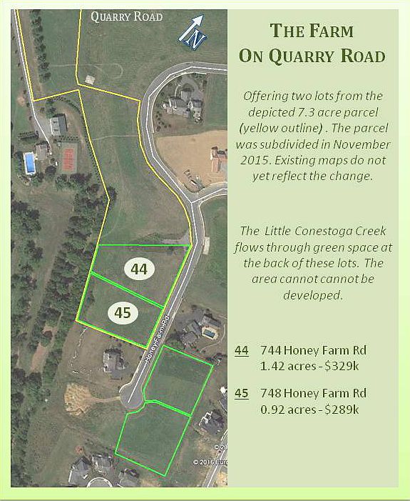 Offering two lots from the depicted 7.3 acre parcel (yellow outline) . The parcel was subdivided in November 2015. Existing maps do not yet reflect the change. The Little Conestoga Creek flows through green space at the back of these lots. The area cannot cannot be developed.