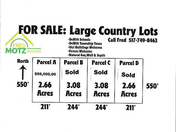 Build your dream home with us, Fred Motz Builder, Inc. Fred and his team have a great reputation for building custom homes in the DeWitt community. We have 1 lots left- located on Howe Road in DeWitt. This is a 2.66 3 acre lot in the DeWitt School District, DeWitt Township taxes, and located only 1 mile from downtown DeWitt. Give us a call to come and meet with our architect- let us design your dream home!