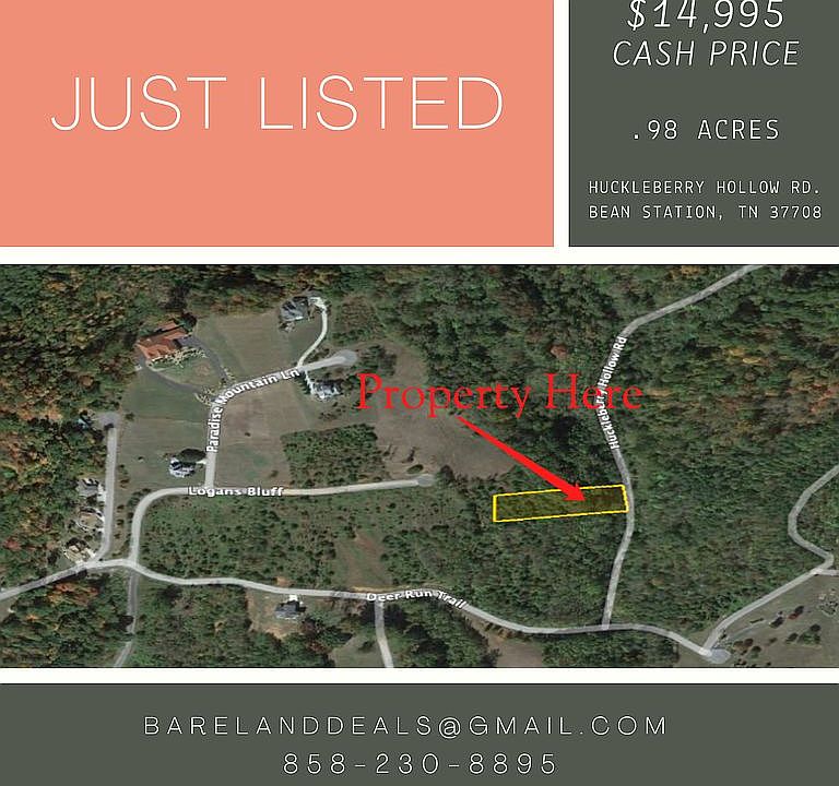 Vacant Land for Sale By Owner in Bean Station, Grainger County, TN 0.98 Acres, 42,689 sqft. Land For Sale on Huckleberry Hollow Rd. Cash Price $14,995 Call, Text, or Email to move forward on this Property! You don’t want to miss out! (858) 230-8993 | Barelanddeals@gmail.com If you love fishing, boating, being outdoors, living away from the city, but close enough to drive in, or looking for your next vacation home or investment property then you will love this lot on Huckleberry Hollow Rd! Access to Cherokee Lake is nearby to enjoy fishing, boating, kayaking, paddleboarding. A public golf course is also located within the town limits. Parks and public recreation areas include Bean Station Town Park, Harris Court Park, and public access to Cherokee Lake via a fishing pier and boat launches. Property Details: APN / Parcel #: 029032M A 00500 Property Address: Huckleberry Hollow Rd. County: Grainger State: TN Parcel Size: .98 Acres, 42,689 sqft Parcel Dimensions: aprox. 104 x 373 x 108 x 387 GPS Center Coordinates: 36.319789028297585, -83.3396507206238 Google map link: https://goo.gl/maps/L2agG2FZ2F3QsVD59 Access to the property? Paved Road Is there a Structure: No Subdivision/lot: Leons Rock Phase 6, Lot 110 Annual property tax: $153.00 Zoning of the property: 00 - RESIDENTIAL Terrain type: Slopes Is the land cleared? No, has trees and brush Are there any survey markings? No Is the property buildable? Yes Can we camp on the property? No RV's allowed on the property? No Mobile homes allowed on the property? No Tiny houses or small cabins allowed on the property? No Is there a total size restriction for any structures on the lot? Yes, a minimum of 1,200 sqft of heated living space Are there any building height restrictions? No What are the setbacks of the lot? 35' from any street line 15' to any interior lot line What is the minimum lot size to build on the property? 30,000 sqft., this lot is 42,689 sqft Is there any time limit to build? No Water: No, Well needed - Bean Station Utility 865-993-2326 Sewer or Septic: No, septic needed - Bean Station Utility 865-993-2326 Electricity: No, not connected, services in the area - Appalachian Electric 865-475-2032 Cash Price: $14,995 Finance Price: $17,995 Save when you purchase CASH! This lot has the building potential for a dream home! We are also offering this property with very affordable, no credit check seller financing. We love to work with buyers to help ensure the best deal that suits any budgeting needs. This is a fully amortized loan at 9.99% interest with NO CREDIT CHECK or prepayment penalty. Additional loan servicing fee added to the monthly We are a private real estate investment company. We buy and sell land throughout the country, we are unable to meet you at the property. We are not utilizing the services of a realtor, you are welcome to visit the property at any time. We encourage you to visit the property at your convenience to make sure the property suits your needs. Disclaimer: We have not been to this property. Everything we know is in this ad. Seller makes no warranties or representations about the land, its condition, or what can be built on the property. The land is being sold AS-IS. Buyer is responsible for doing all due diligence and verifying accessibility, utilities, build-ability, and all other information contained herein prior to purchase.