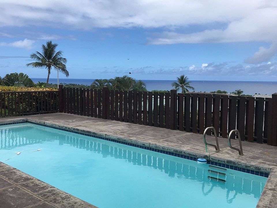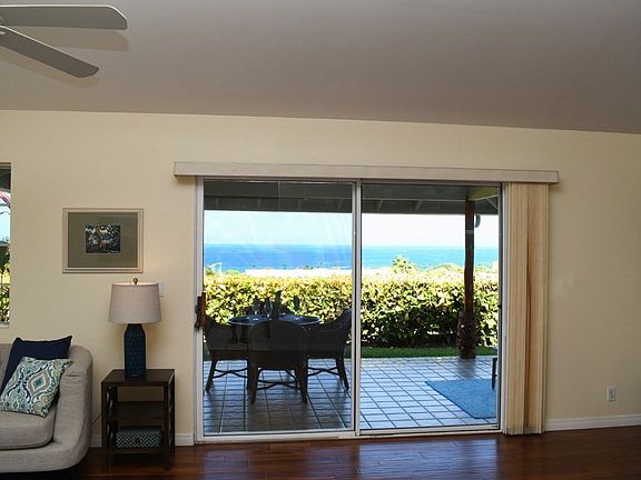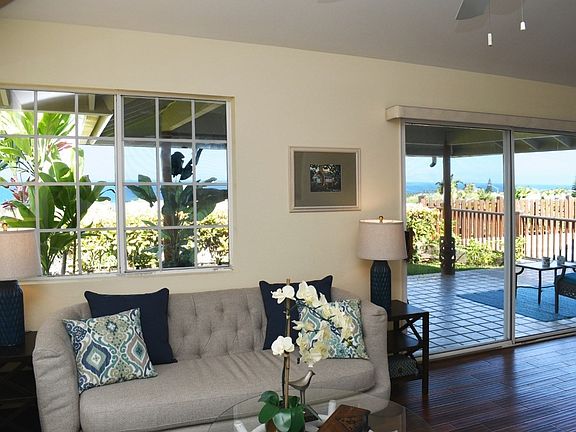 This ocean view home perches above the street, giving you privacy and the opportunity to enjoy tropical breezes and spectacular views year round. The sparkling pool and covered lanai face the expansive ocean horizon; the space is so inviting you'll want to spend all your time outdoors. The open floor plan features ocean views, vaulted ceilings, engineered hardwood floors and ceiling fans throughout. The kitchen has plenty of cabinets & counter space, including a center island. An adjacent office with built-ins sits close by. Two of the three bedrooms overlook the pool and boast ocean views. The main bedroom has a big walk-in closet and an updated attached bath with double vanity and huge walk-in shower. The two additional bedrooms share an updated bathroom, also with a large shower and updated vanity. An interior laundry room connects to the two car garage. There is additional room for a third vehicle along side the garage. A grassy enclosed yard and garden (with sprinkler system) sit opposite of the ocean-facing windows and offers a permitted 1/2 bath and outdoor shower that is easily accessed from the pool area. Several upgrades have been made to the property including a new solar water heater, three solar powered roof fans, all new window screens and new pool pump, chlorine sand filter and vacuum. Komohana Kai is a well-established neighborhood with sidewalks, streetlights and underground utilities, located just minutes from central Kona, close to grocery stores, gas stations, restaurants and services.