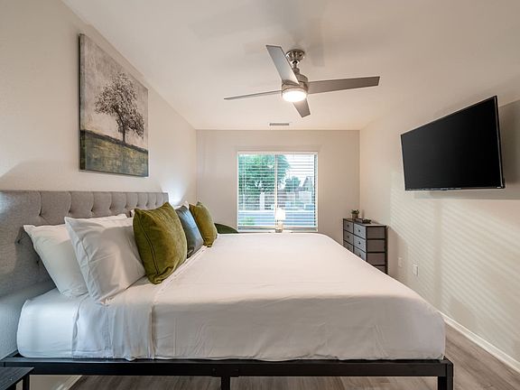 - Bedroom #4: King bed, nightstands, table lamps, smart TV, dresser, ceiling fan, closet, luggage rack