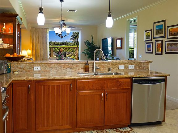 Pride of ownership is evident in this highly upgraded, beautiful turnkey Beach Villa! The Beach Villas is an exquisite gated community located on 13 acres of lushly landscaped grounds. The Beach Villas offers two exotic pools, spas, Cabana and BBQ area and a new and advanced open air fitness center. Luxury meets comfort in this highly sought after community. Your new Villa features stainless steel appliances, granite counter tops and a spacious lanai which overlooks the well manicured Waikoloa Beach Course, views of the lake and Kohala mountains and even a peek at Maui and Mauna Kea. Tastefully furnished with many upgrades that include new furniture, fresh paint, a remodeled master shower, custom curtains, Hunter Douglas blinds and a Phantom front door screen for wonderful cross breezes. Your new Villa has extra parking directly behind your garage, the convenience of an elevator and well planned amenities. Take a stroll to the nearby sandy beaches or shop at the King and Queens Shops that offer everything from Grocery Store, a variety of restaurants, open air markets, fabulous boutique shops and even a new Luxury Cinema. The privacy and luxury of the Beach Villas is only surpassed by its convenient location. Internet/ Cable with over 300 channels are now included in your low monthly HOA fees.