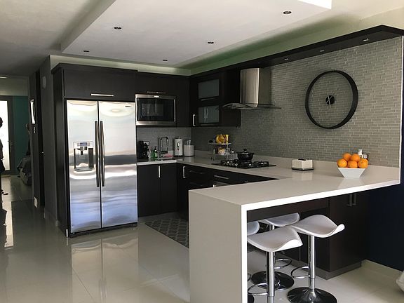 It s a coner house. 3 bedrooms 2 bath Remodel kitchen with Gas stove, fridge, microwave. Air conditioning in all rooms. Solar hot water. Washer and dryer. Garage. Small terrace. Furniture living room and master bedroom, night stands and tv furniture in two bedrooms and living room. Owner pays security fee