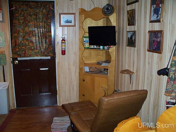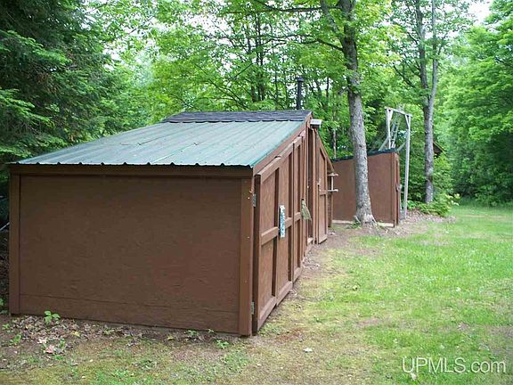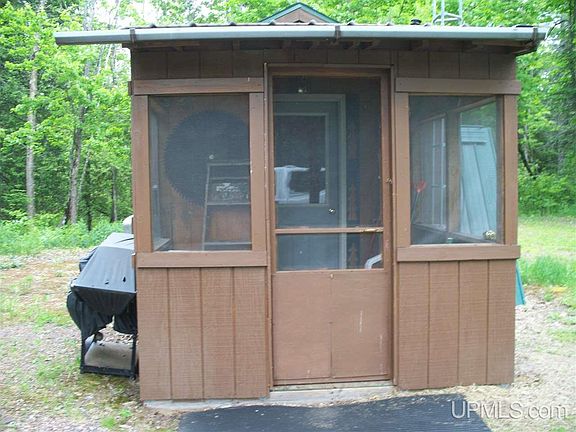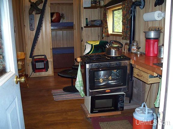 Great Northern Retreat that is very private and off the grid. 1/2 mile solid gravel road leads to a well groom property. Cabin includes a sitting area and compact kitchen along with a private two bed bunk room and a private shower room. Outbuildings include an outhouse, generator room with 2 generators, 1000 watts and 3500 watts, a building that includes a sauna and there is also a two stall four wheeler garage and a 16x36 cover port that could host a RV. Horseshoe driveway and other roads go thru out the forty. All roads are gravel and solid. Fire pit, picnic area, food plat for wild game and an area to set up a blind, whether being bear or deer.
