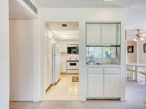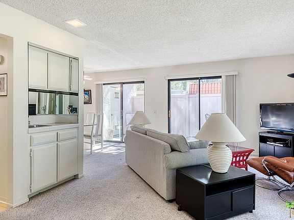 One of the best positions in beautiful Mountain View Villas, this bright and clean 3 bedroom, 2 bath is the perfect home to relax and unwind with its park like views and privacy. The open living room dining room has two sliding glass doors overlooking your private patio, with open kitchen, sit up counter and wet bar! The third bedroom opens off the entry and living room offering a convertible room to be used as a den, office, yoga space or bedroom. The master bedroom is spacious with an en suite bath. Side by side washer and dryer are in unit, and a storage unit is off the patio. A 2 car carport is attached. Walking within Mountain View Villas is popular as are the 5 swimming pools and tennis courts. A fantastic value for Rancho Mirage on land you own, come take a look!