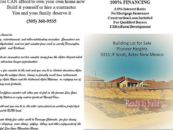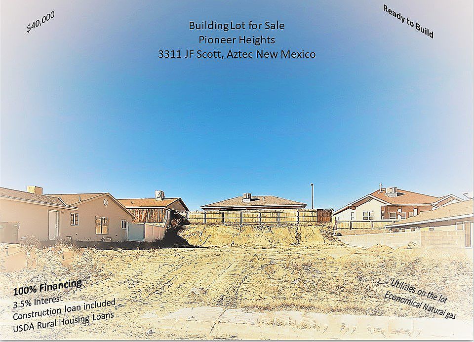 0% down, 3.5% interest rate, construction loan included. View lot, ready to build, located in Pioneer Heights Subdivision, Aztec NM. All utilities on lot. Excellent neighborhood. Financing options for qualified buyers. YOU CAN AFFORD TO OWN A NEW HOME FOR YOUR FAMILY