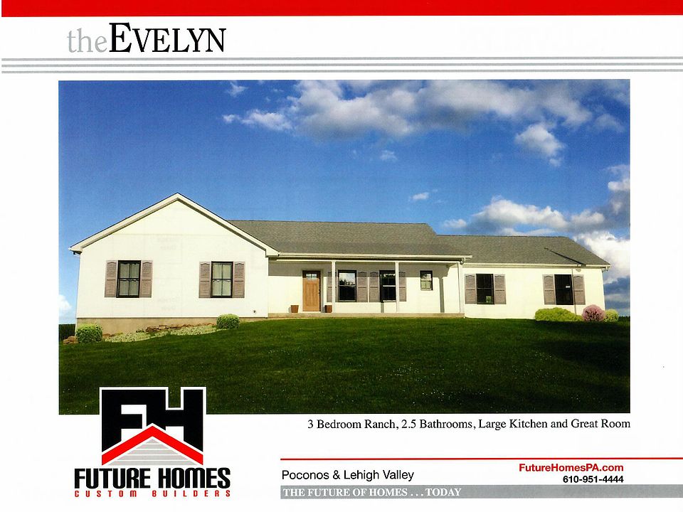 3 Bedroom Ranch, 2.5 Bathrooms, Large Kitchen and Great Room. Future Homes offer buyers of new construction homes extraordinary value and an unmatched final product. Our custom and luxury homes are completely customizable by you the homebuyer. With our convenient showroom, vast selection or samples, and wealth of experience, we can assist you in designing the home or your dreams.