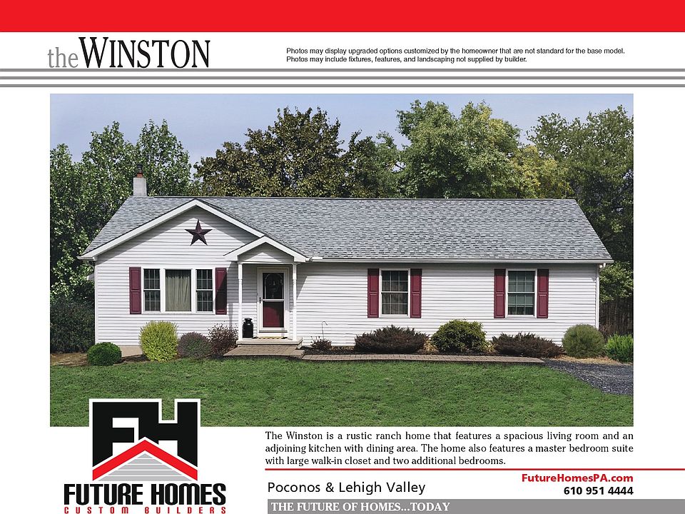 The Winston model offers a master bedroom suite with 2 additional bedrooms all on one level, a full basement, and much more. Future Homes offer buyers of new construction homes extraordinary value and an unmatched final product. Our custom and luxury homes are completely customizable by you the homebuyer. With our convenient showroom, vast selection or samples, and wealth of experience, we can assist you in designing the home or your dreams.