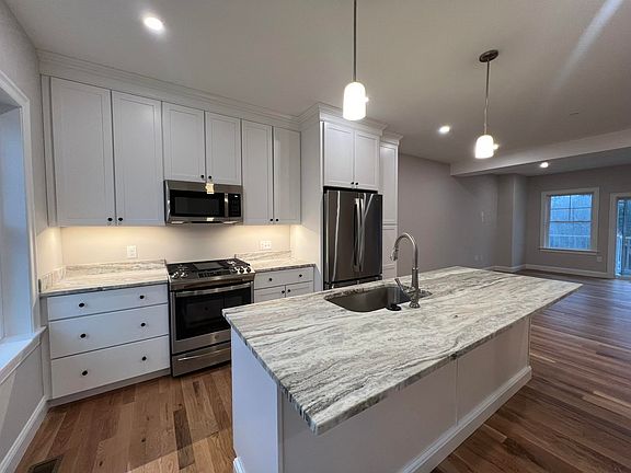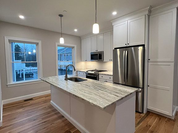 NEW CONSTRUCTION! Welcome to Juniper Commons, a new 50-unit townhome pocket community in a great Portsmouth location. Abutting vast wooded conservation land, this beautifully landscaped community will feature three bedroom, three bath townhomes. The two-car garage entry leads into a finished first floor space ideal for an office, or mud/storage area. Up the hardwood stairs the living level is an inviting open layout with high ceilings, hardwood flooring, and great natural lighting. The spacious living and dining area opens to beautifully finished kitchens including cabinetry to the ceiling, pantry storage, oversized island, stainless appliances, and high end stone countertops. Sliding glass doors off the kitchen leads to a private deck space. The third floor has three bedrooms and two baths, including a primary suite with walk-in closet, and bath with tile shower and glass enclosure. Hardwood flooring throughout all bedrooms and living areas. Central air. Professionally landscaped community with community park, sidewalks, and trail leading to the lush wooded open space behind the homes for all to enjoy!