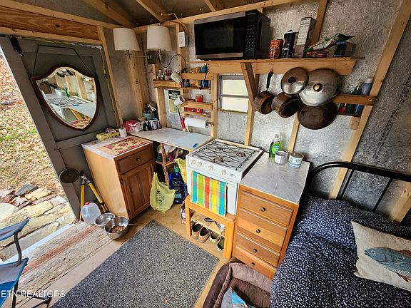 Welcome to Kerrigan Road, this getaway features 100 foot of rock outcroppings down highway 68 with a level pad ready for you to build your carport or steel building on. Attached is an 8x12 Masterbuilt building conveying fully furnished with bed, stove and microwave. Use a generator to keep your compound off grid. (does not have power) Kerrigan is walking distance to the Cumberland Trail, hunting and side by side trails. Soil will not pass a percolation test for a septic system.