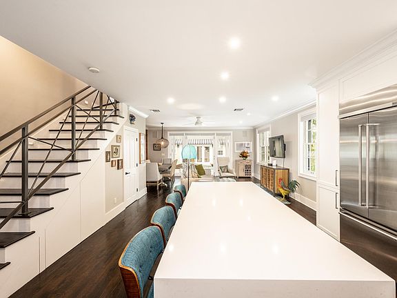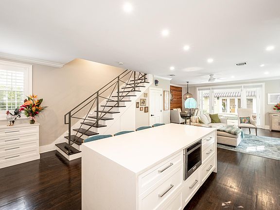 As you enter the main home you will be captivated by the huge high-end chef's kitchen, natural light, and hardwood floors. A white, quartz waterfall island has seating for four and a built-in microwave. Custom cabinets, recessed lighting, and stainless-steel countertops complement this unique home. Stainless steel KitchenAid appliances and a large refrigerator are sure to impress the Chef in your group.