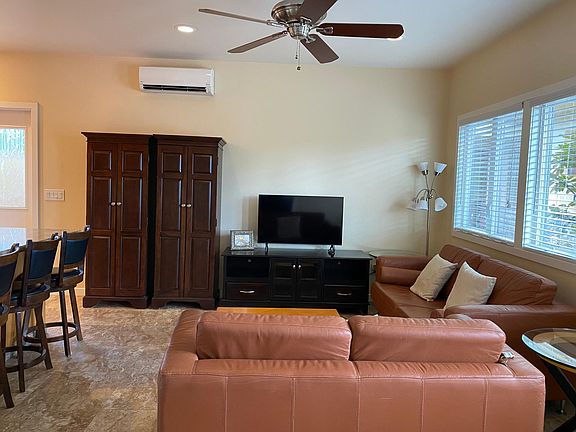 Beautiful custom built Wailea style house in Kihei. 2 bedrooms, (second bedroom is smaller and set up as home office) and 1 bath. Main bedroom has Queen size bed, 2 dressers, night stands, TV and large closet. Living room has 2 leather couches, 2 glass end tables, coffee table, TV on cabinet and 2 large storage cabinets. Office (second bedroom) has bookshelf, desk with chair, and storage cabinet. Quiet, safe neighborhood. 2 dedicated parking spaces on property next to house. Overnight street parking is prohibited. Stacked washer and dryer in closet of office room. Plenty of additional cabinet storage. Fully furnished, includes all furniture, bedding linens, towels, and items as shown in photos. Fully equipped completely stocked and furnished kitchen. Ceiling fans (3) in bedroom, office and living room. Full-size split AC units in bedroom, office and living room. Granite countertops in kitchen and bath vanity. Electric glass top range, microwave, dishwasher, disposal, washer, dryer, and refrigerator. Solar hot water. All windows have blinds. Porcelain tile floors throughout. Private lanai area with table and 4 chairs.