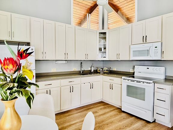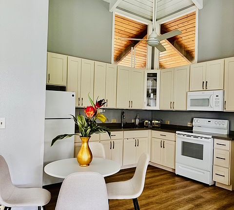 Newly updated, elegantly furnished, charming private guest house with separate storage, located on a large 1 acre lot with a big garden and mature fruit trees. The guesthouse is located in the upscale neighborhood of Wailea / Maui Meadows, just 3 minutes down to be sandy beaches of Wailea and its long white sandy beaches, and elegant Shops of Wailea. The guesthouse is private and fully gated, has a separate driveway and parking for three cars. It has two large covered patios leading out from the kitchen and living room area and from each of the two spacious bedrooms. The entire guest house feature high vaulted ceilings, wood-look and tile flooring. Each bedroom has a private en-suite bathroom with a large walk in shower. Each bedroom has a queen bed, a large mirrored closet, and a side board / writing desk, and a large glass slider leading out to the front covered patio with a patio seating set for two. The newly remodeled kitchen has elegant granite countertops, extra tall/high white shaker cabinets, top appliances (full electric oven, microwave, fridge with separate freezer) and a dining set seating 4. The spacious living room area has high vaulted ceilings, AC, and is elegantly furnished with a beautiful velvet couch, a coffee table, beautiful artwork and lots of natural lighting, as well as a large class slider leading out to the covered patio with a dining set seating 4. The guesthouse overlooks a large garden with a mature fruit tree orchard, and a spacious separate storage shed, with double barn doors, which can be used for an artist studio. The guesthouse comes with diner and cookware, linens and towels.