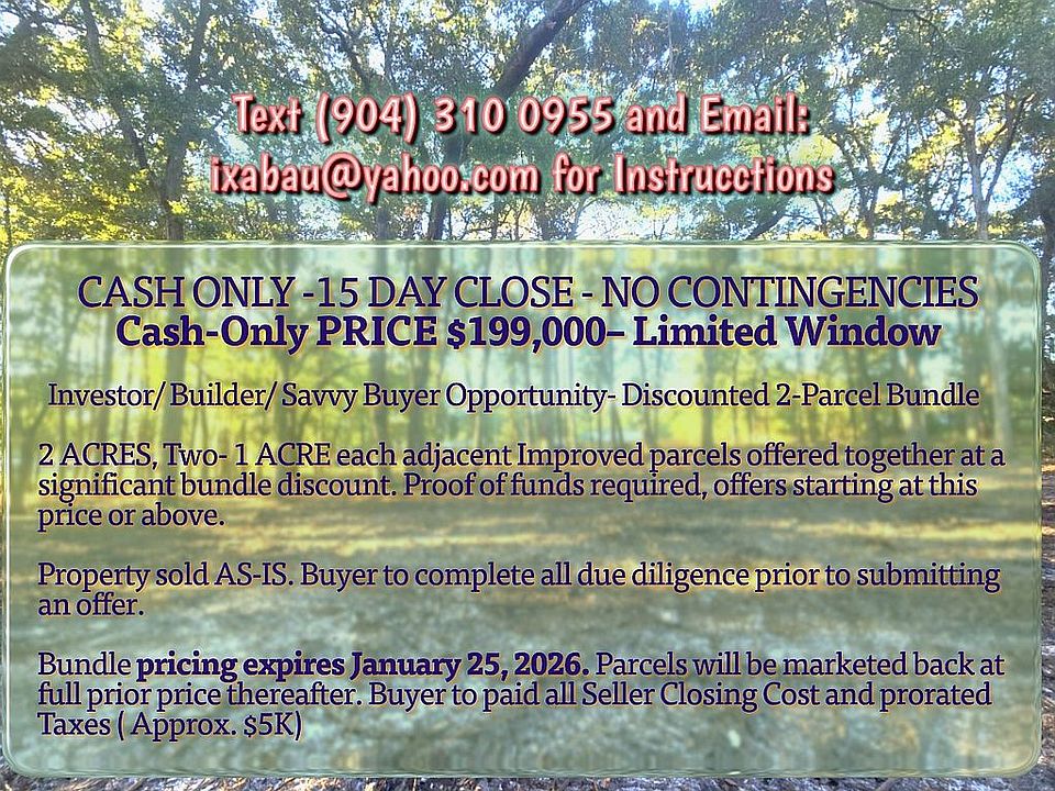 Improved 2.01 Acres Land Near City Amenities & Amelia Island Resort Paradise! 85094 and 85102 Knowles Rd. Yulee FL 2 PARCELS -1 ACRE EACH) Access via private easement with compacted rock surface Fully Brush-Cleared and ready for you. Sold AS- IS: - 1 SEPTIC TANK on site. recently located - 2 Fully Operational Water-WELLS, - 1 Commercial Filtration System - 3 Wood Poles, - 1 New Electrical Box, and Electricity is accessible at the front of the property. - 1 Water Well Report - Surveys available upon request for Qualified Buyers Located just minutes from top-rated schools, shopping centers, Amelia Island beaches, and the airport. A prime opportunity to build or invest in a growing area!