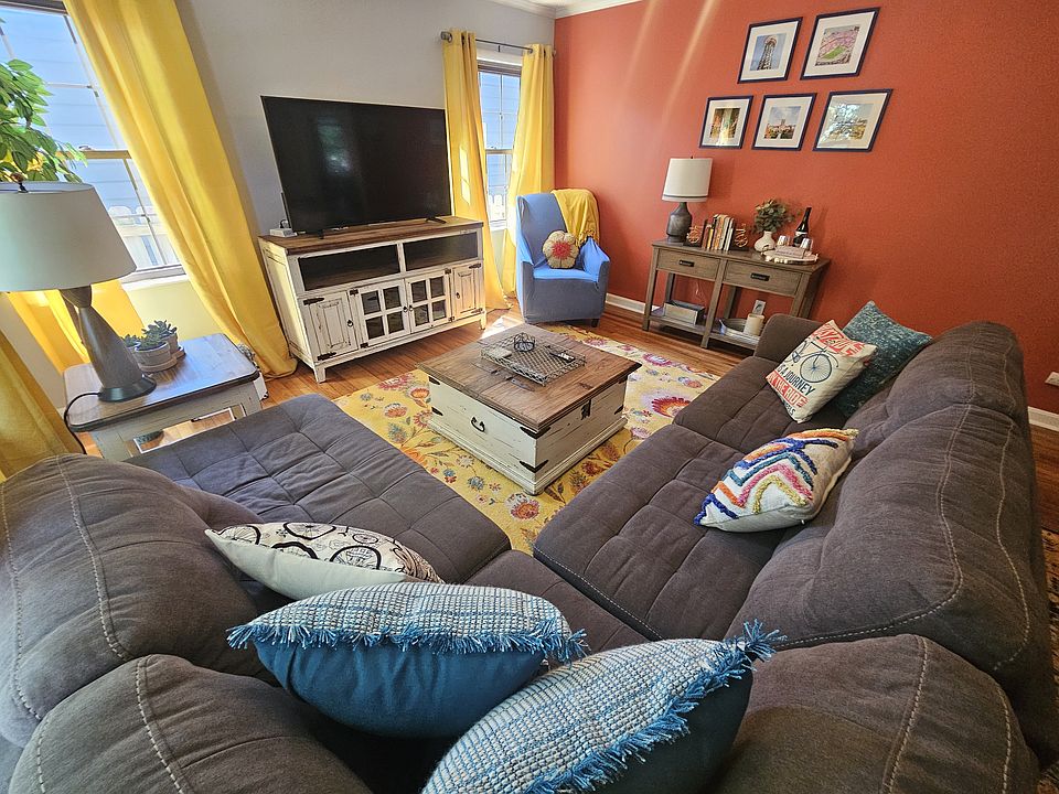 The home features a cozy front porch with a loveseat for people or bird watching in the evening. A large yard and back porch with Adirondack-style chairs, a dining table, a firepit, and gas grille for outdoor entertainment.