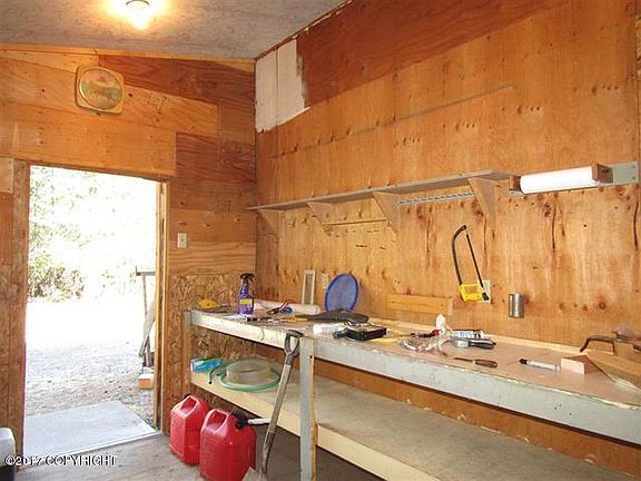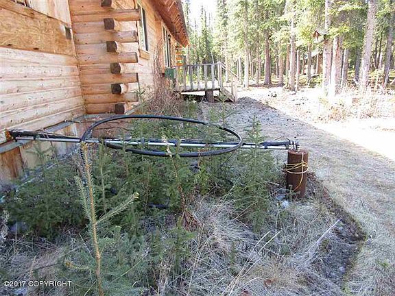 Log home has a lot of potential! Excellent floor plan with open living, dining, kitchen area. Sits on 9.25 acres close to town but private at end of road with neighbors not too close. No covenants and no property tax. Custom kitchen cabinets includes island. Foundation is concrete footer with concrete block pony wall and crawl space. Six inch logs are sealed with permachink. Metal roof, arctic entry, cedar porch, detached garage with heated shop/man cave. House is set up for wood stove but currently has a forced air furnace, wood stove in shop, storage buildings, crib septic is six foot culvert. Back yard has screened in summer space perfect for enjoying Alaska summers. Cable tv and DSL internet is available. Potential for owner financing.