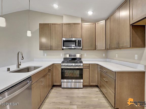 PERCHED ON A SLOPE WITH PANORAMIC VIEWS OF EAGLE RIVER VALLEY AND SOUTH TOWARD ANCHORAGE. PEACEFUL & PRIVATE AT THE END OF A DEAD END STREET. Check out this COZY getaway. Peninsula Kitchen all finished in Stainless Steel-Quartz and Hardwood Cabinets. Great room w/gas Fireplace, Deck and Large Window for the View & lots of Sun. Main floor Primary suite. Unfin basement-4th bdrm & Rec room.
