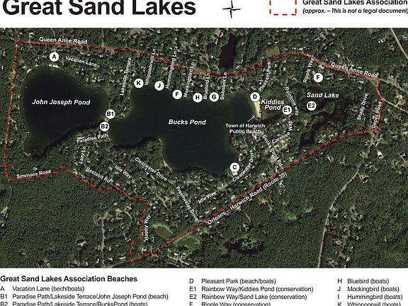 Prime Location with frontage on Lakeside Terrace in East Harwich. Discover an exceptional opportunity to build your Cape Cod dream home in the desirable Great Sand Lakes area of East Harwich. This rare lot offers the perfect blend of natural beauty, neighborhood charm, and unbeatable convenience. Desirable Corner Position situation with direct frontage on Lakeside Terrace, providing access to a well-established neighborhood of year-round and vacation homes. Ready for your vision. Part of a beloved network of freshwater ponds and welcoming residential streets known for recreation, tranquility, and natural beauty. Just minutes to Harwich Center, local shops, ocean beaches,the Cape Cod Rail Trail and major roadways. Enjoy your private access to Bucks Pond and John Josephs Pond, popular for swimming, kayaking, and summertime relaxation.