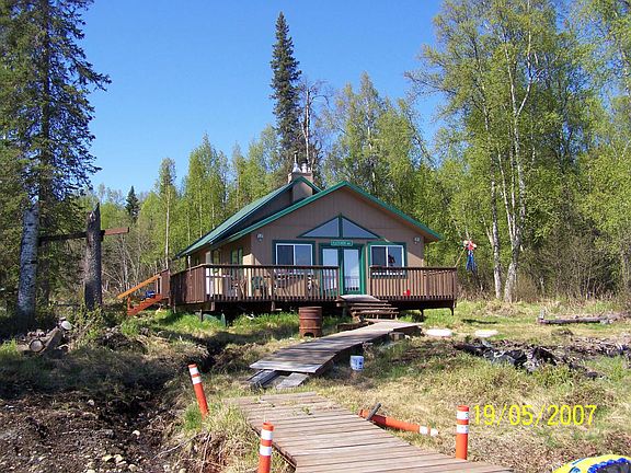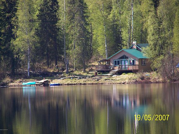 Amazing turnkey Butterfly lake cabin - completely wired for electric (generator). Hike(short), fly or snowmachine. Comes with barge/15hp motor and 7KW Honda generator and Gheeno boat with trailer and 4hp Mariner outboard motor . Inside has a private bedroom, a loft with 4 queen beds, kitchen with propane fridge & stove, micro, sink and good cabinet/counter space and dishes. Backroom area with vanity, storage and porta-potty. 2 living areas, including couches, tables, TV, etc. Wood stove and two oil monitor heaters, a well (not high producing), a large deck, a 8'X20' connex and a 8'x16' arctic tent and a Craftsman riding mower. Foundation has been recently updated. This cabin is AWESOME!