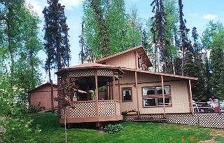 Waterfront home or cabin located on pvt peninsula Horseshoe Lake. 100'+/- frontage w/views of Talkeetna & Chugach Mtns. ''Turn key'' w/furnishings. Several out buildings. Heated shop w/attached garage for toys. Shed, guest sleeping cabin, gazebo w/hot tub. Large new docks, landscaped, nice!