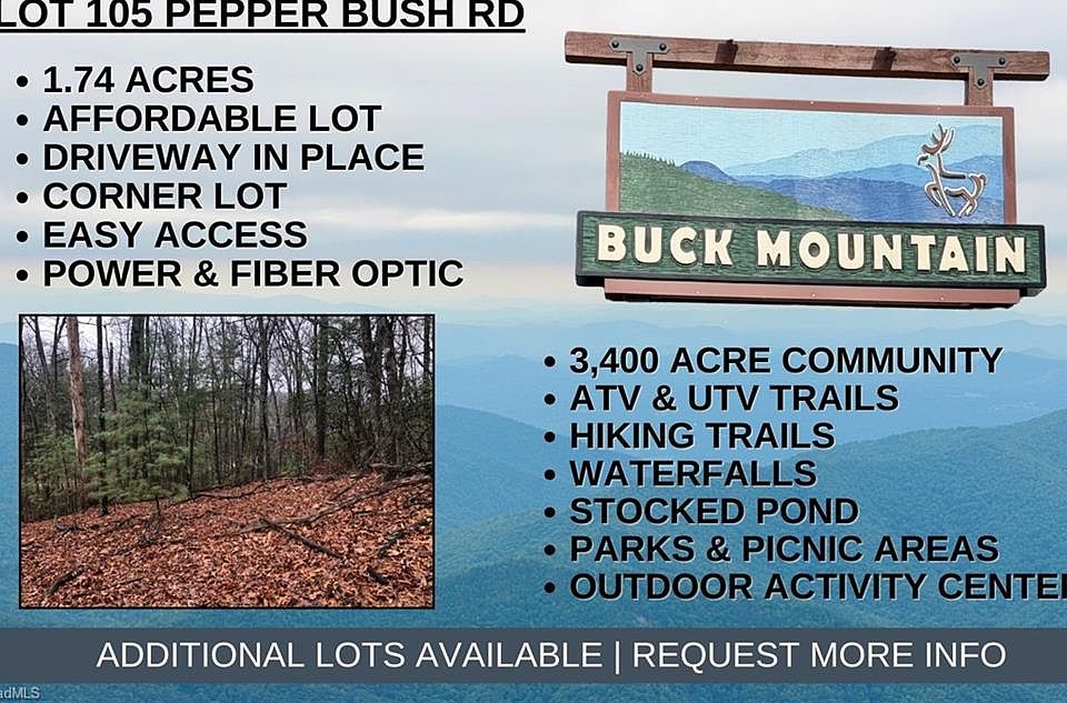 AFFORDABLE BUILDING LOT 1.74 acre corner lot with gravel driveway in place. Located in the 3,400 acre Buck Mountain community...ONLY GATED ATV COMMUNITY in Wilkes County. Easily accessible lot. Build your weekend getaway or vacation rental property here! Work from home! Fiber optic available. Potential mtn view w/tree trimming. Long & short-term rentals allowed. Escape the stress of daily life by surrounding yourself w/abundant wildlife & soothing sounds of nature. Just minutes from High Country activities. Buck Mtn is a prime location! Arrive at the gate from Winston in only 1 hour & from Charlotte in 1 hour 40 min. Close to BLUE RIDGE PKWY, ASU, shopping, dining, golf, mtn biking & skiing. Buck Mtn has hard to find amenities like ATV & Hiking Trails, Parks, Fishing Pond, Water Falls, Pavilions, Community Ctr, Helipad, Outdoor Activity Center with Amphitheater for live music and more! Make lasting memories while hiking or riding ATVs on the miles of trails.