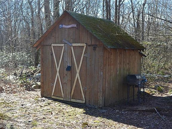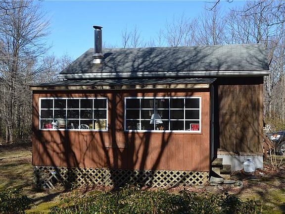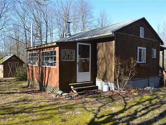 Wonderfully secluded cabin nestled on 10 Acres and very near the state game lands. Hunter's paradise or weekend camp in the wilderness. Open living room with convenient electric baseboard heat and wood burning stove to gather around. Nice kitchen area with handy propane stove and refrigerator. 1 Bedroom loft overlooking the main living area. Additional spacious and bright sunroom to enjoy the beautiful surroundings of mature trees and rock formations. Outside you'll find a spacious shed, outhouse, fire pit and tree stand.