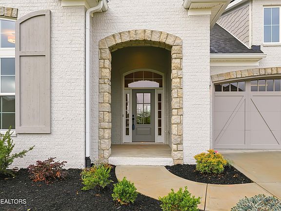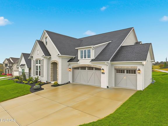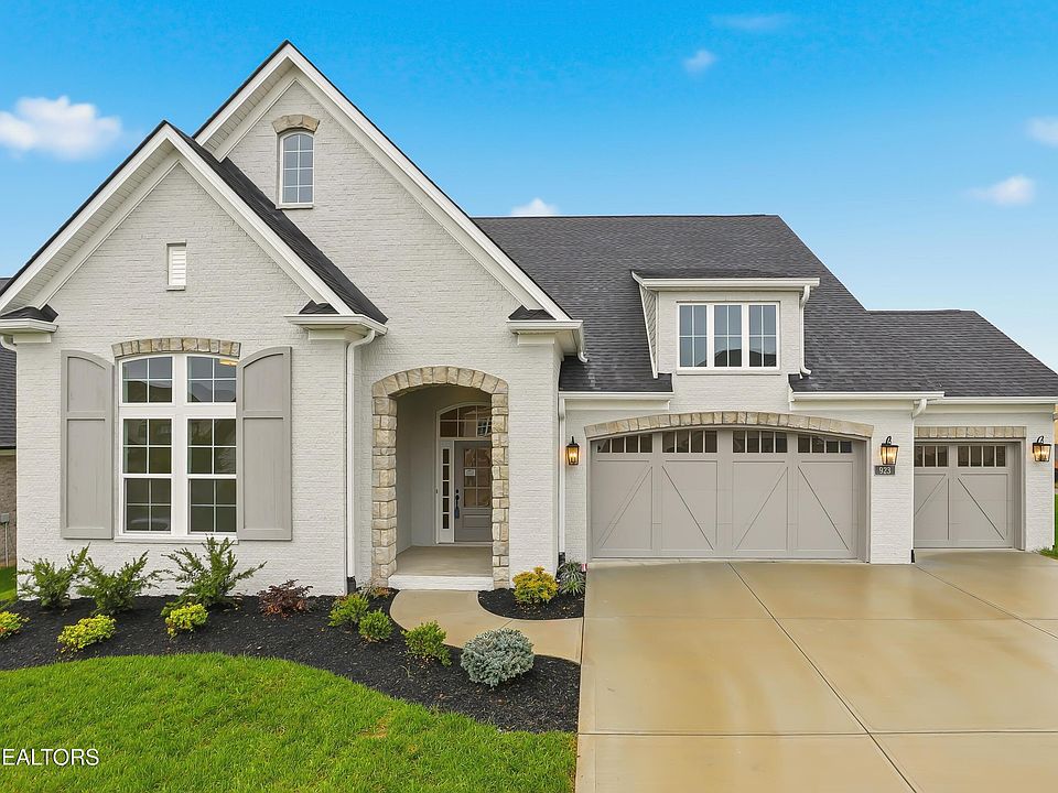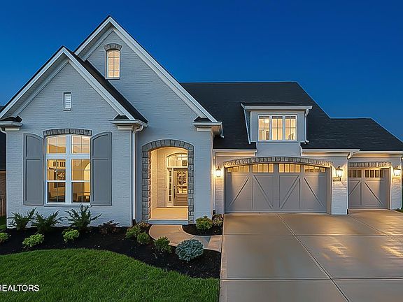 HARD TO FIND RANCH HOME WITH 3 CAR GARAGE located on a cul-de-sac street in the Grove at Boyd Station community, just across the street from McFee Park in Farragut. The exterior brick of this home is painted Light French Gray. The Morgan plan is designed with a touch of European elegance. As you enter, you'll be welcomed by a gracious 12-foot-tall well-lit foyer. To the left of the entrance, you'll find two private bedrooms with hardwood floors and generously sized closets. The largest of these bedrooms, featuring lofty 12-foot ceilings and an airy ambiance, is often utilized as the owner's study. A separate and oversized dining room makes entertaining and family dinners easy. The open, gourmet kitchen includes plenty of painted cabinets, a 30-inch gas cooktop, microwave, and oven located in the cabinet, a wood vent hood, a tile backsplash, and quartz countertops. The kitchen also has an oversized island, a walk-in pantry, and a bright breakfast nook that opens into the beautiful great room complete with a coffered ceiling, a centered fireplace, and a built-in bookcase. The great room also has a 12-foot by 8-foot glass sliding door that opens onto the covered and screened rear porch, the perfect spot for your morning coffee.