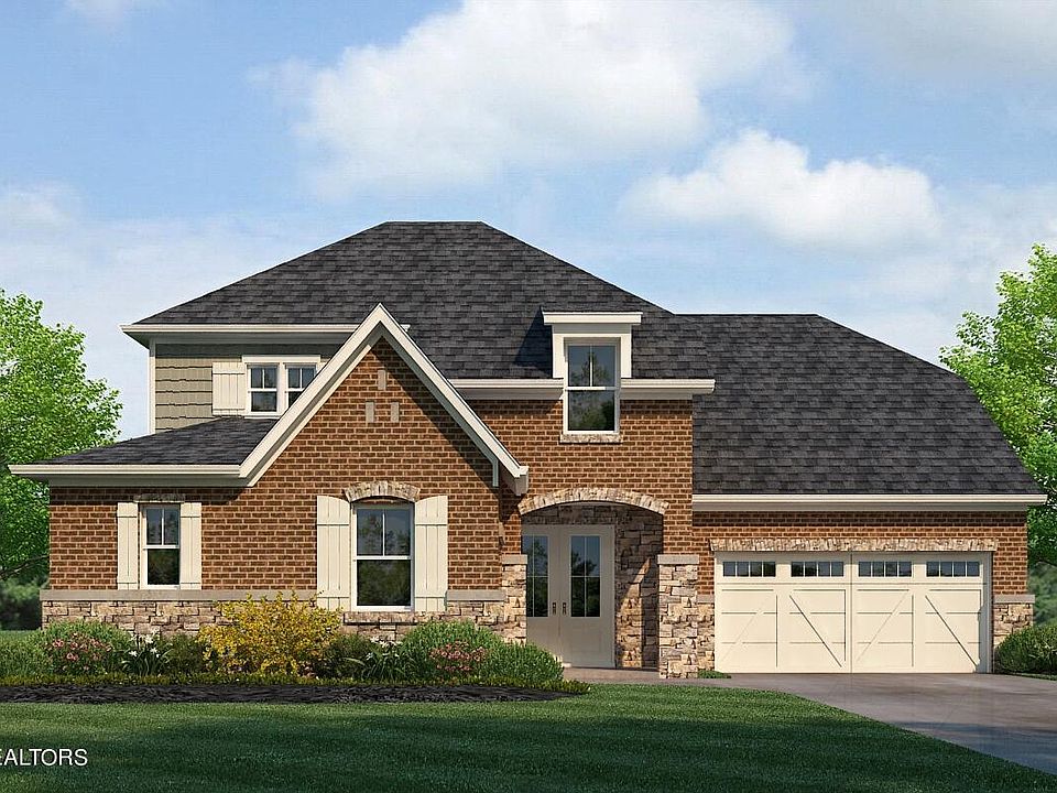 Essex E elevation. Gorgeous 2 story great room with second level windows. Fantastic view of Hardin Valley from the rear of the house. Upgraded kitchen cabinetry and appliances. Extensive hardwood throughout. Formal DR and breakfast area. Study and Owner's suite on main. Second level features 3 BRs, 2 baths and loft.